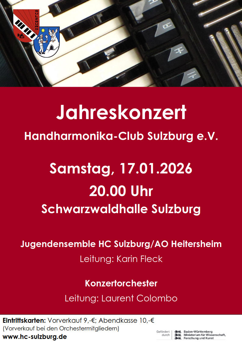 Bald ist es wieder soweit und der Handharmonika-Club lädt wieder zu seinem Jahreskonzert in der Schwarzwaldhalle in Sulzburg ein. Unsere Dirigenten Laurent Colombo und Karin Fleck haben wieder ein spannendes Programm vorbereiten. Lassen sie sich überraschen und merken sich den letzten Samstag im Januar vor. Wir versprechen einen genussvollen Abend auf dem man sich schon jetzt freuen kann.